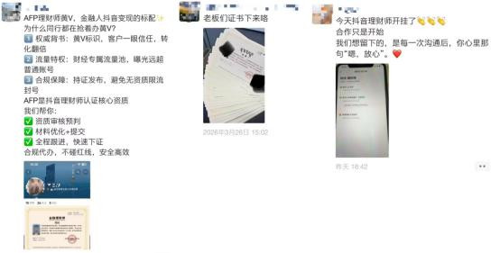 记者在该短视频平台搜索“理财师黄V认证”,发现大量声称可办理相关申请材料的机构或业务员。一位主页描述为“专注店铺入驻、类目报白”的电商机构服务商在视频中介绍:“申请认证只需上传个人身份证正反面照片、金融理财师证书和官网对应的查询截图。我们前前后后帮助几百位IP办理了理财师证书,然后就可以认证黄V了。值得给大家提醒一下,这份理财师证书并不是万能的,在另外的平台申请认证是不能使用的。”