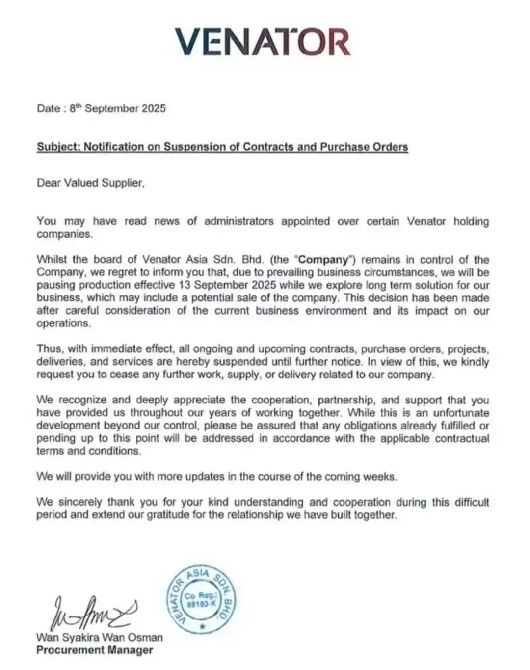与此同时,泛能拓亚洲公司Venator Asia Sdn. Bhd.宣布,鉴于目前商业环境,泛能拓亚洲工厂将自9月13日暂停生产。公告称,尽管Venator Asia Sdn. Bhd.(以下简称 “公司”)的董事会仍控制着公司,同时为业务探索长期解决方案,其中可能包括公司的潜在出售。这一决定是在仔细考虑当前商业环境及其对公司运营的影响后做出的。因此,即刻生效,所有正在进行和即将进行的合同、采购订单、项目、交付和服务均暂停,直至另行通知。鉴于此,公司恳请客户停止公司相关的任何进一步工作、供应或交付。并表示,在未来几周内,公司将为客户提供更多最新消息。